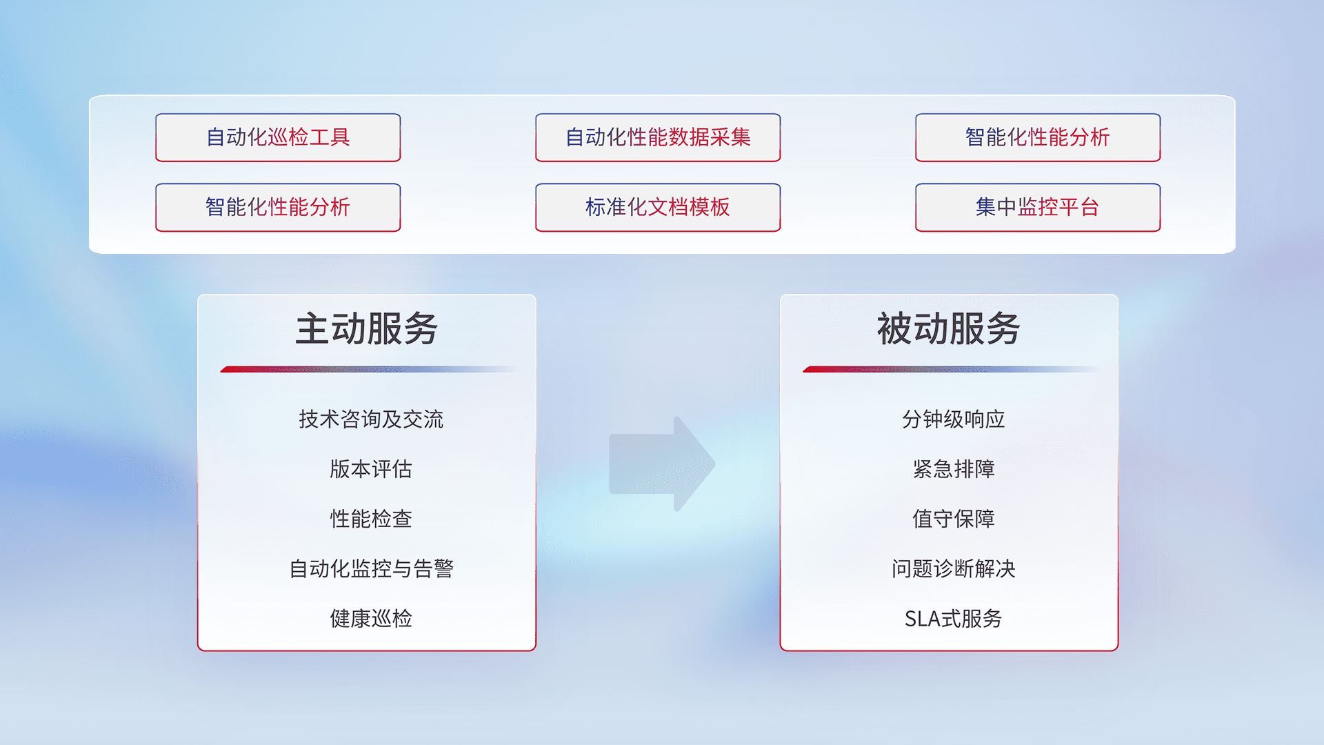 智能化工具和标准化文档,,,保障服务质量,,,提供主动服务(包含技术咨询、、版本评估、、、性能检查、、、自动化监控与告警、、、健康巡检)和被动服务包含(分钟级响应、、紧急排障、、、、值守保障、、问题诊断解决、、、、SLA服务)。。。