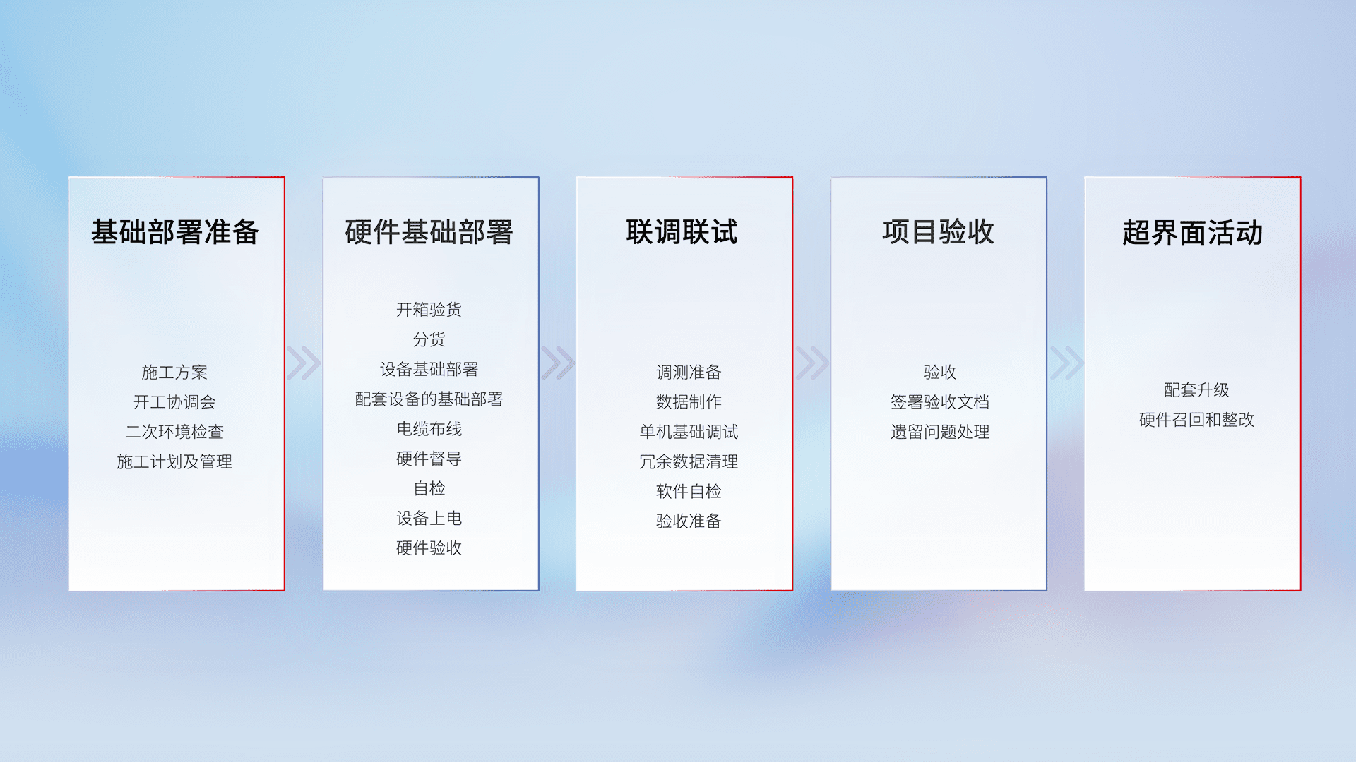 从基础部署准备、、、硬件基础部署、、、联调联试、、、、项目验收、、、、越界面活动的全过程可追溯,,,,保证施工质量和进度。。。。